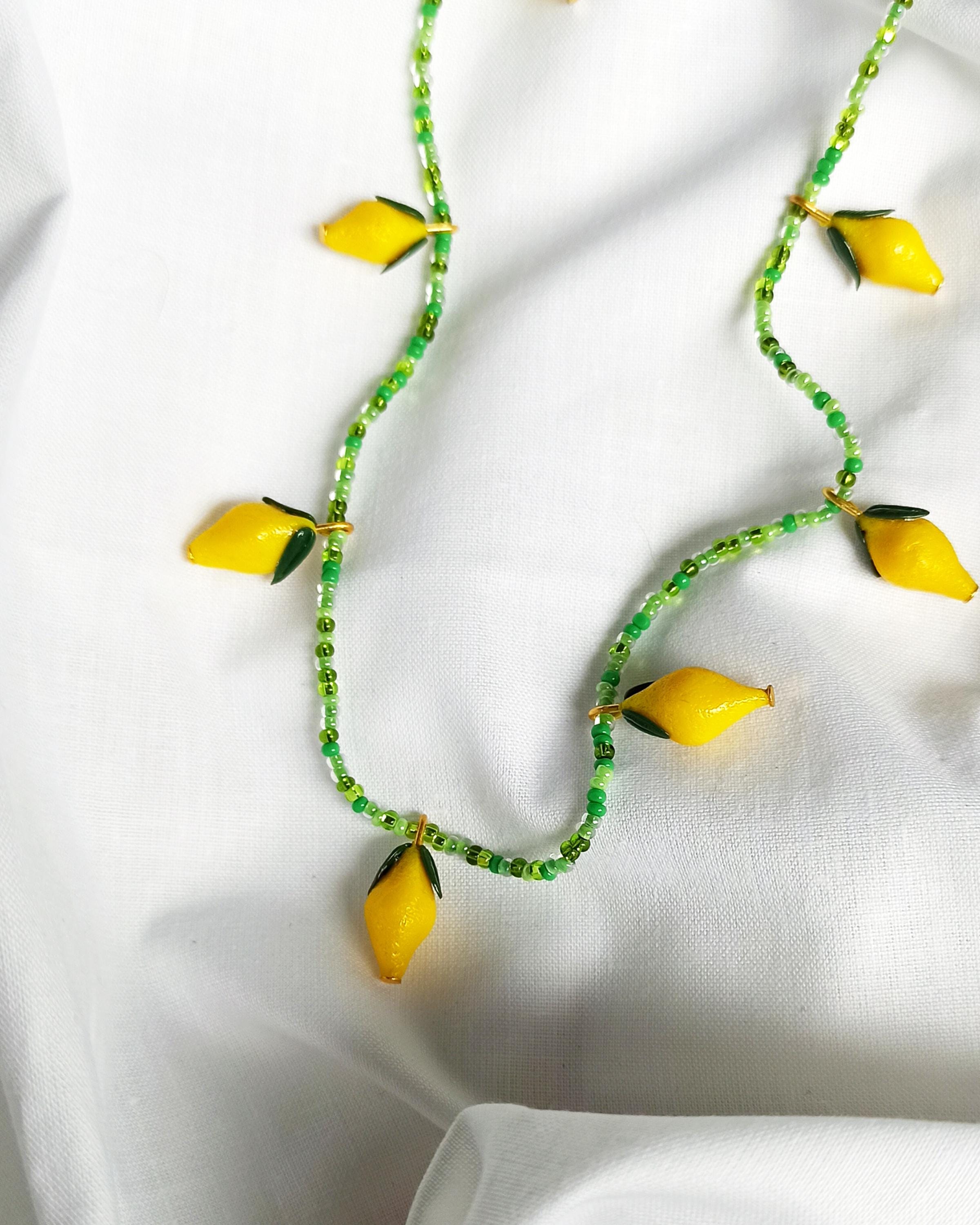 Small and dainty summer yellow lemon beaded necklace with. 🍋 So lightweight for everyday use to add a touch of magical fruit art to your style.