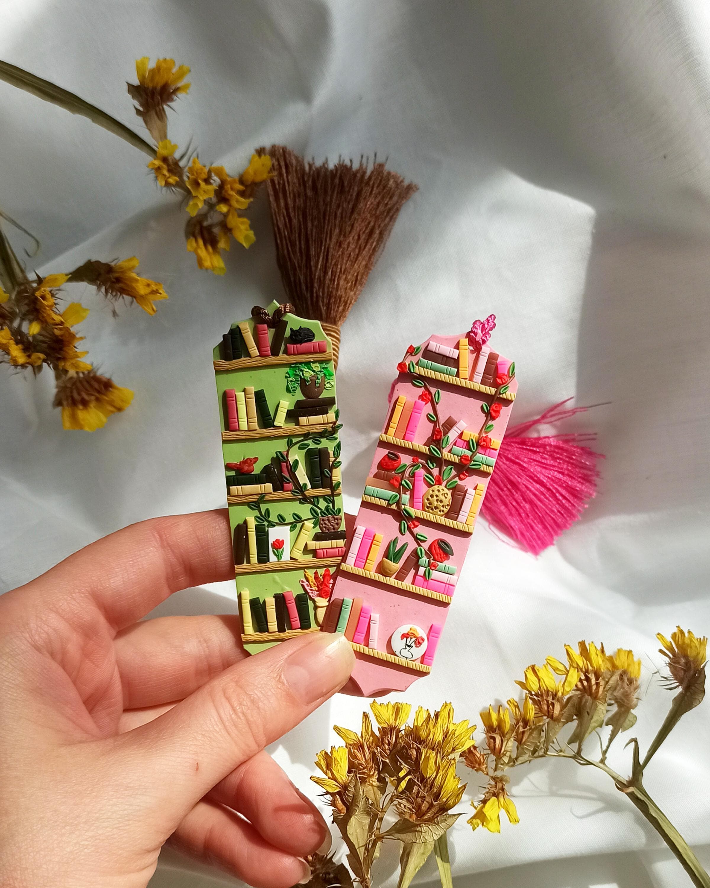 Beautifully hand-crafted Bookshelf Bookmarks in pink and light purple colors, made from polymer clay, which means they are incredibly lightweight and comfortable.